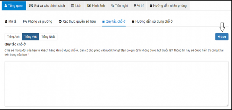 – “Quy tắc chỗ ở”: note một số quy định cho khách thuê chẳng hạn như có phòng hút thuốc không, có cho phép mang theo vật nuôi không … đừng quên nhấn “Lưu” để lưu thông tin.